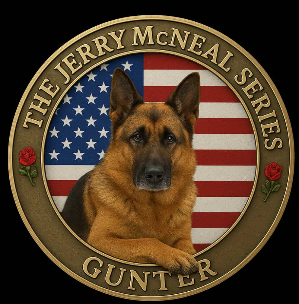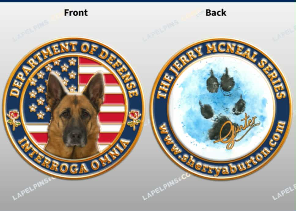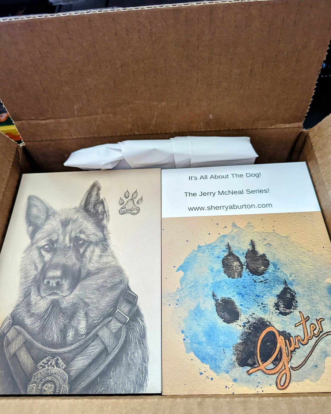 You will also get a 3 inch Gunter magnet, a series card showing the titles to date in order, a bookmark, and pawprint sticker, along with one custom-commissioned, double-sided, 5x7 print copy illustration of Gunter, as drawn by artist, Bethany Marie. Bethany sketched Gunter's likeness from the book covers. She expertly added Gunter's K-9 police vest and incorporated his missing ear. Bethany created the pawprint that is used on the coin and sticker, with the help of an actual German Shepherd, who allowed her to use his paw to create the image.